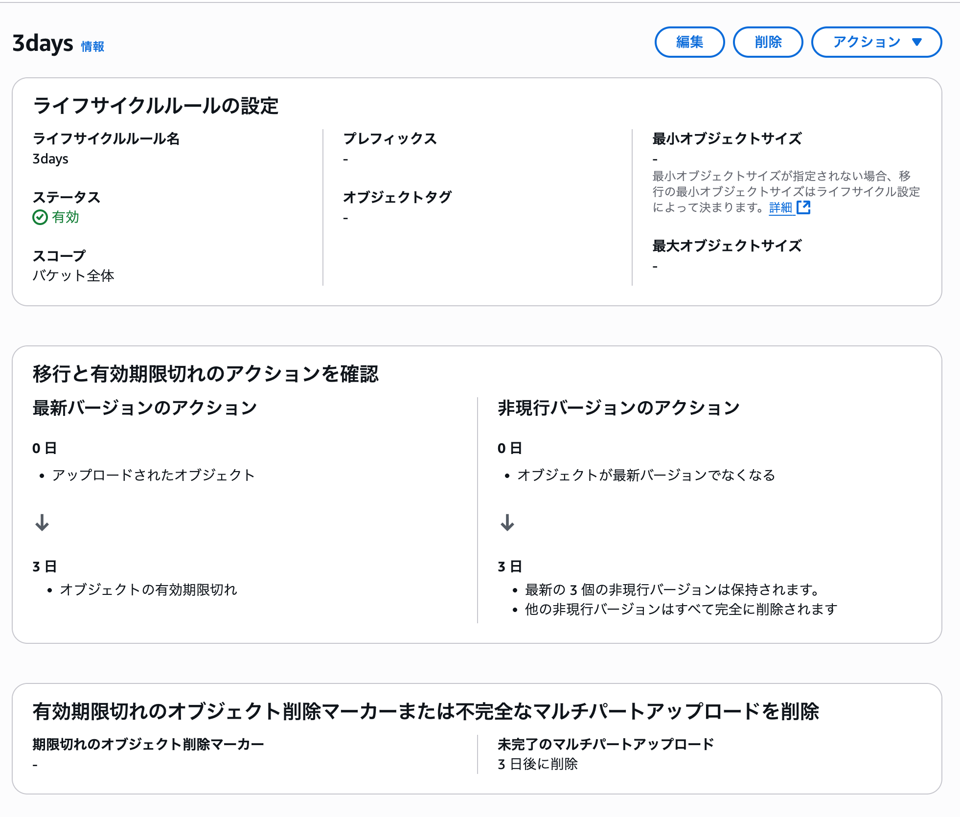 が、3日経過したら消えるという運用ができるかを確認したくシェルは使用せず、ライフサイクルを使用することにしました。