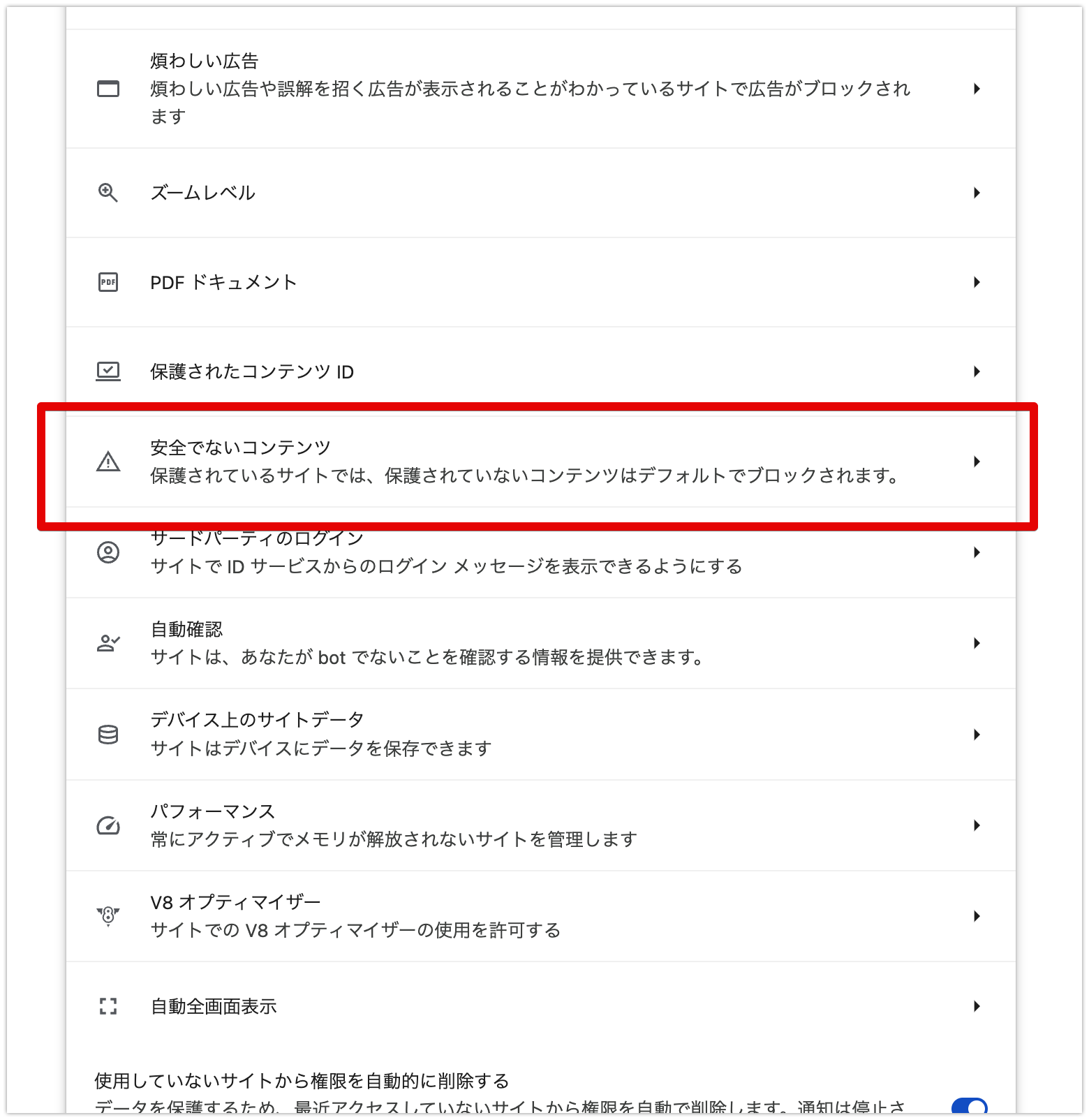 設定 > プライバシーとセキュリティ > サイトの設定 >安全でないコンテンツ
