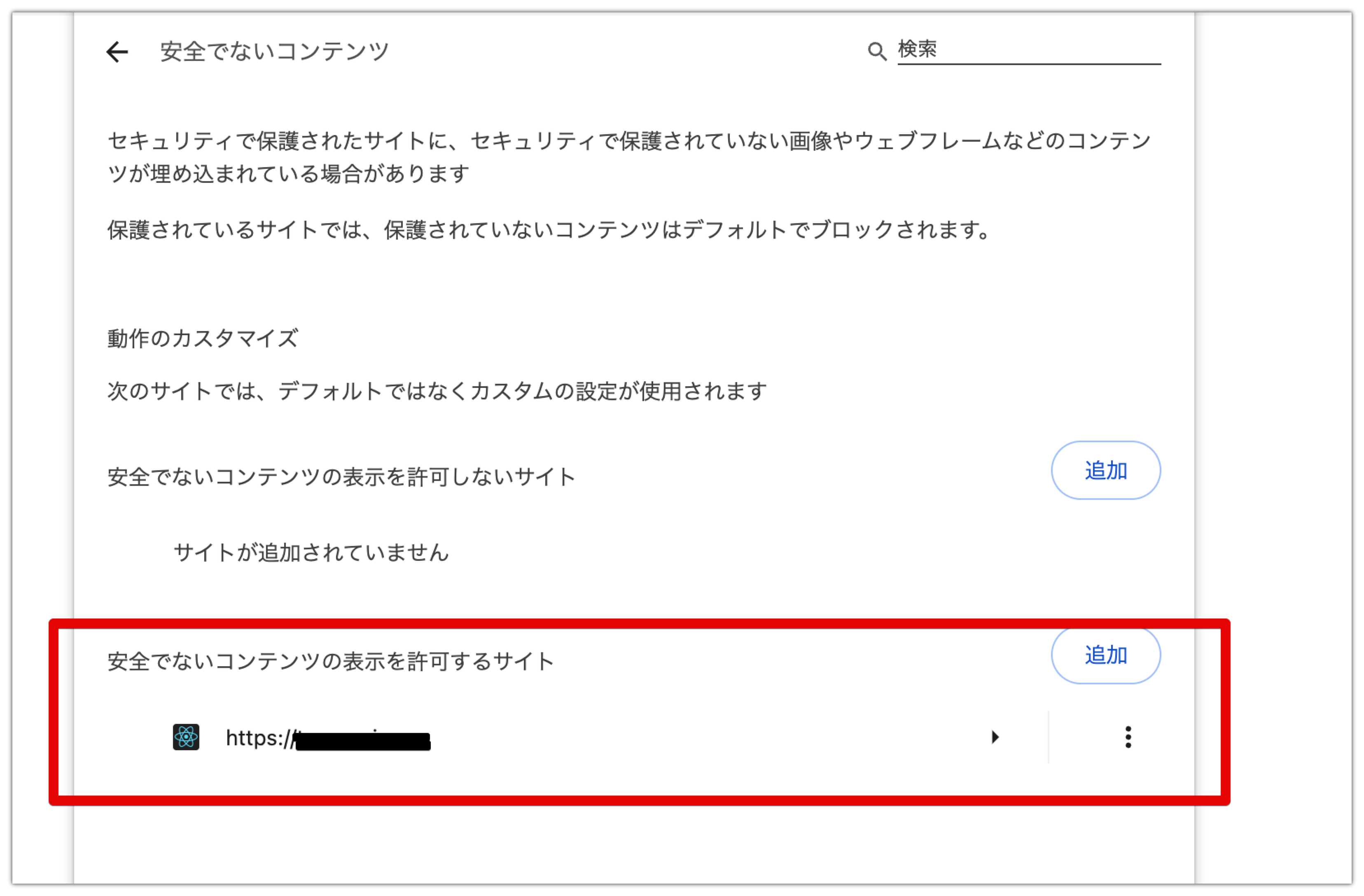 「安全でないコンテンツの表示を許可するサイト」にhttpのURLを追加します。